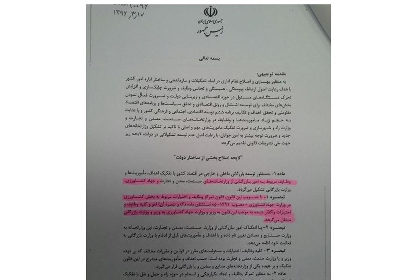 بنابراین گزارش بر اساس لایحه «اصلاح بخشی از ساختار دولت» که به تازگی به تصویب هیئت وزیران رسیده است در "ماده 1" آن اشاره می کند:« به منظور توسعه بازرگانی داخلی و خارجی در اقتصاد کشور با تفکیک اهداف، ماموریتها و وظایف مربوط به امور بازرگانی از وزارتخانههای صنعت، معدن و تجارت و جهاد کشاورزی، وزارت بازرگانی تشکیل میگردد».