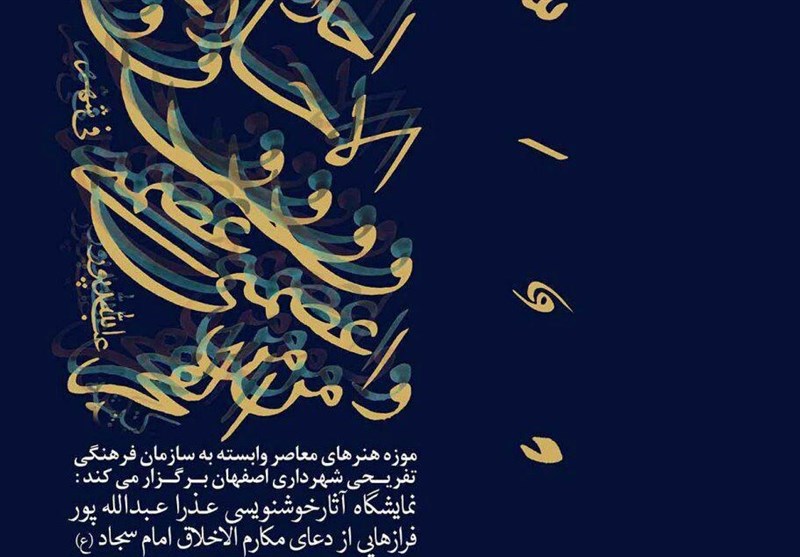 به گزارش خبرگزاری تسنیم از اصفهان، بهنقل از روابطعمومی سازمان فرهنگی تفریحی شهرداری اصفهان، به مناسبت ماه مبارک رمضان، نمایشگاهی از آثار خوشنویسی "عذرا عبدالله پور" در گالری شماره پنج موزه هنرهای معاصر اصفهان افتتاح میشود.
