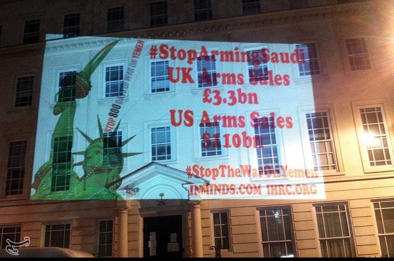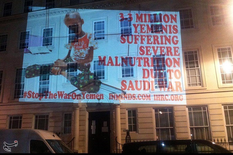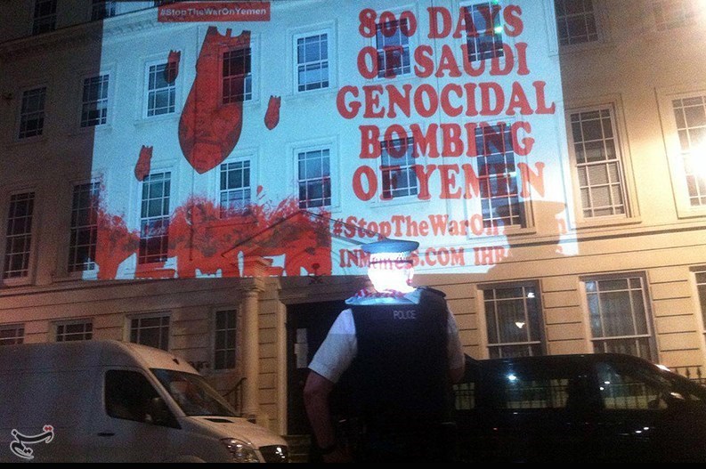 به گزارش گروه دفاتر خارجی خبرگزاری تسنیم، شب گذشته و به مناسبت هشتصدمین روز حمله نظامی به یمن، جمعی از فعالان ضد جنگ تصاویر کودکان یمنی را روی دیوار سفارت عربستان سعودی در لندن پروژکت کردند.