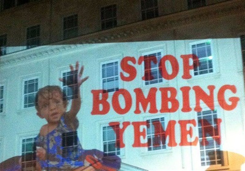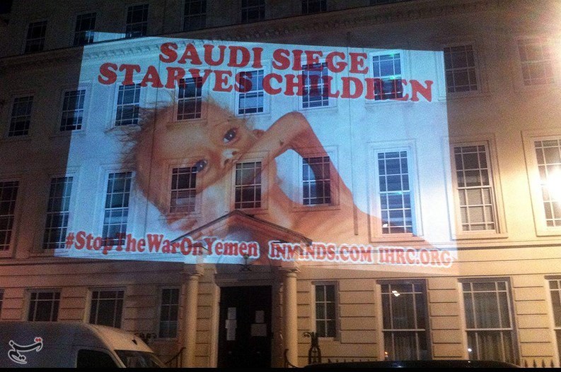 جمعی از فعالان ضد جنگ تصاویر کودکان یمنی را روی دیوار سفارت عربستان سعودی در لندن پروژکت کردند.