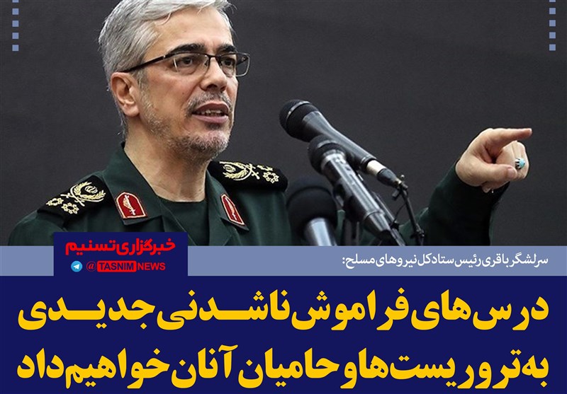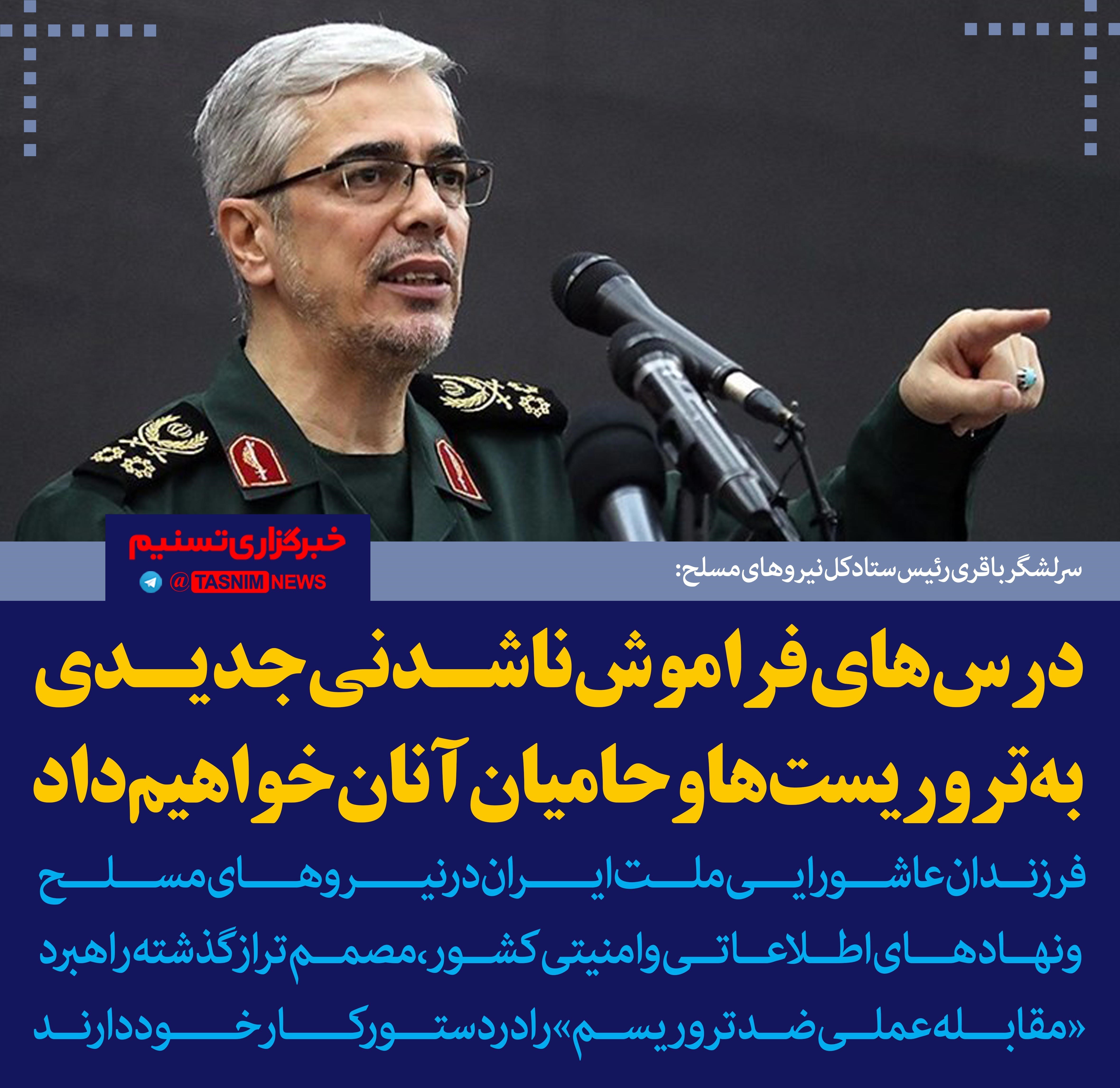رئیس ستادکل نیروهای مسلح در پیامی به مراسم گرامیداشت شهدای حادثه تروریستی تهران تأکید کرد: درس‌های فراموش‌ناشدنی جدیدی به تروریست‌ها و حامیان آنان خواهیم داد.