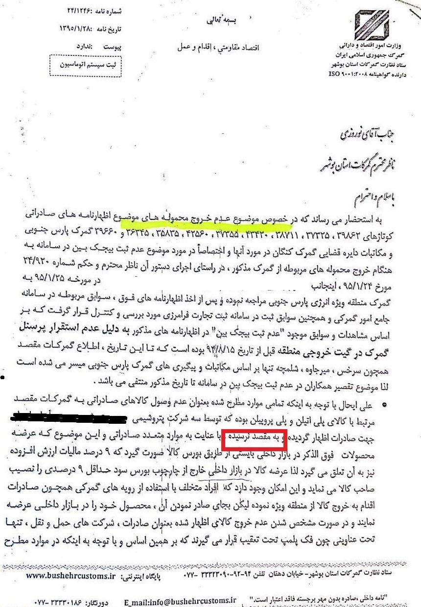 تیم بررسی تأکید دارد، در صورت اثبات عدم رسیدن محموله به مقاصد صادراتی، احتمال جعل اسناد (گواهی خروج) نیز وجود دارد، این درحالی است که در سند زیر مشخصاً تأکید شده در خصوص گمرک منطقه ویژه انرژی پارس جنوبی موضوع عدم وصول کالا به گمرک مقصد محرز شده است.