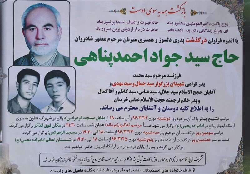 به گزارش خبرگزاری تسنیم از سمنان، این پدر گرانقدر شهیدان والامقام احمد پناهی روز گذشته و براثر بیماری و کهولت سن آسمانی شد.