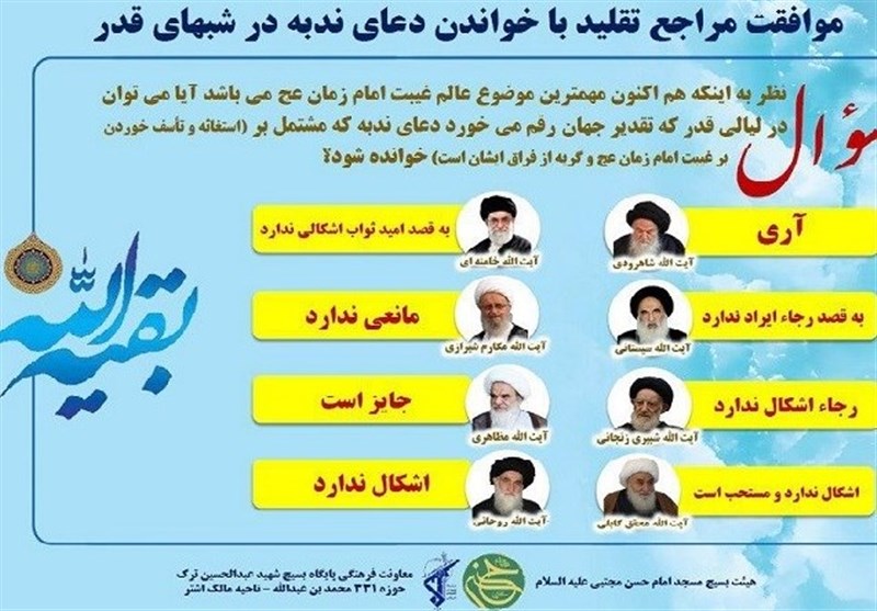 به گزارش خبرنگار فرهنگی باشگاه خبرنگاران پویا هیئت بسیج مسجد امام حسن مجتبی(ع) شهرک مسعودیه تهران در یک اقدامی جالب دست به سؤال از مراجع اعظام تقلید درباره حکم قرائت دعای ندبه در شب قدر زد.