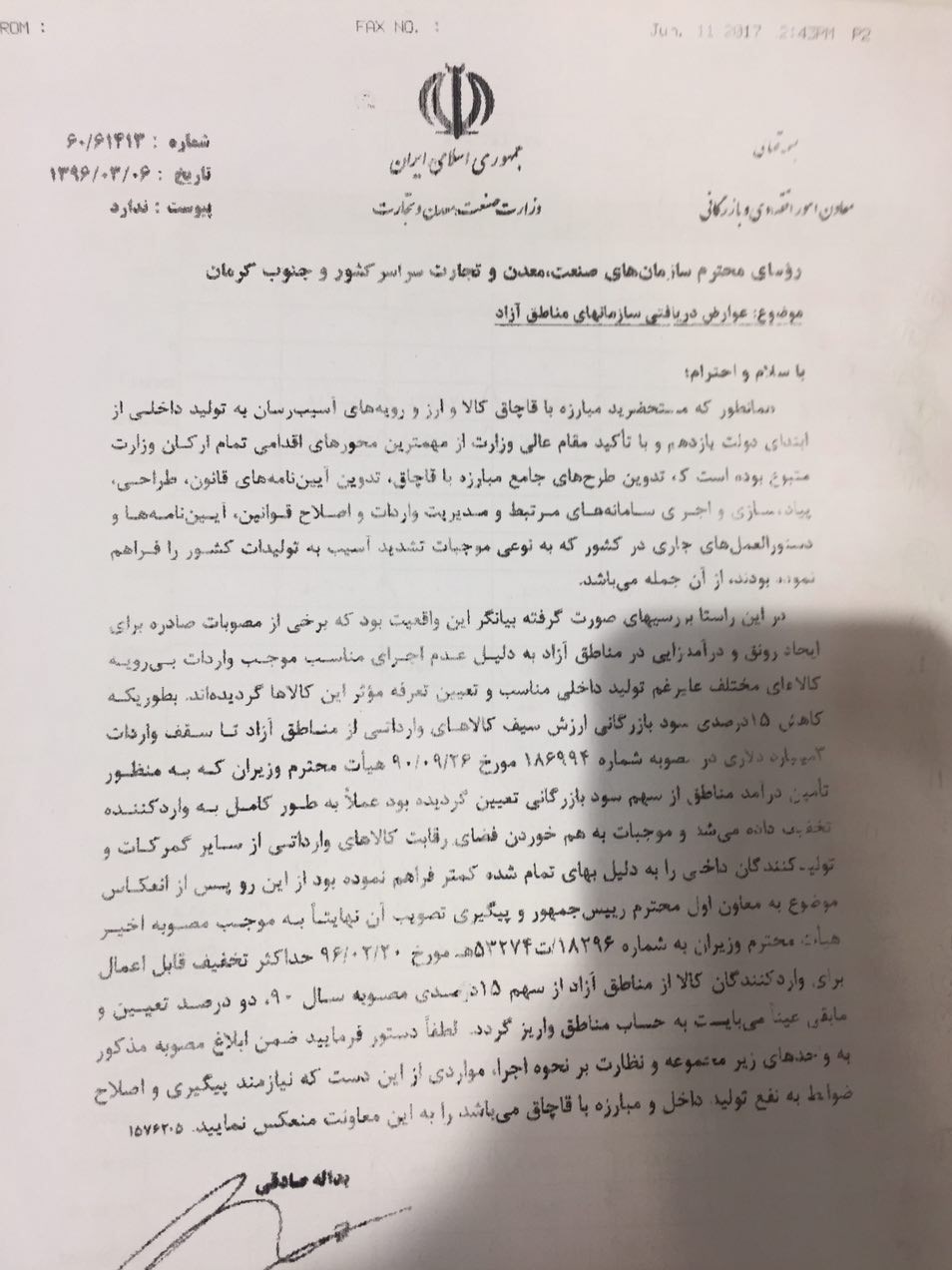 در نامه یدالله صادقی معاونت امور اقتصادی و بازرگانی وزارت صنعت آمده است: به موجب مصوبه اخیر هیأت وزیران مورخ 20 اردیبهشت ماه سال جاری حداکثر تخفیف قابل اعمال برای واردکنندگان کالا از مناطق آزاد از سهم 15 درصدی مصوبه سال 90 ، 2 دوصد تعیین و مابقی عیناً می بایست به حساب مناطق واریز گردد . لطفاً دستورفرمایید ضمن ابلاغ مصوبه مذکور به واحدهای زیر مجموعه و نظارت بر نحوه اجراء، مواردی از این است که نیازمند پیگیری و اصلاح ضوابط به نفع تولید داخل و مبارزه با قاچاق می باشد را به معاونت منعکس نمایید.