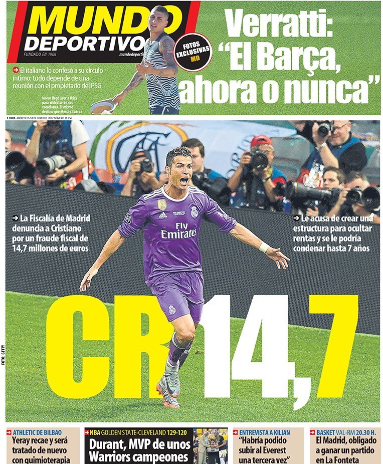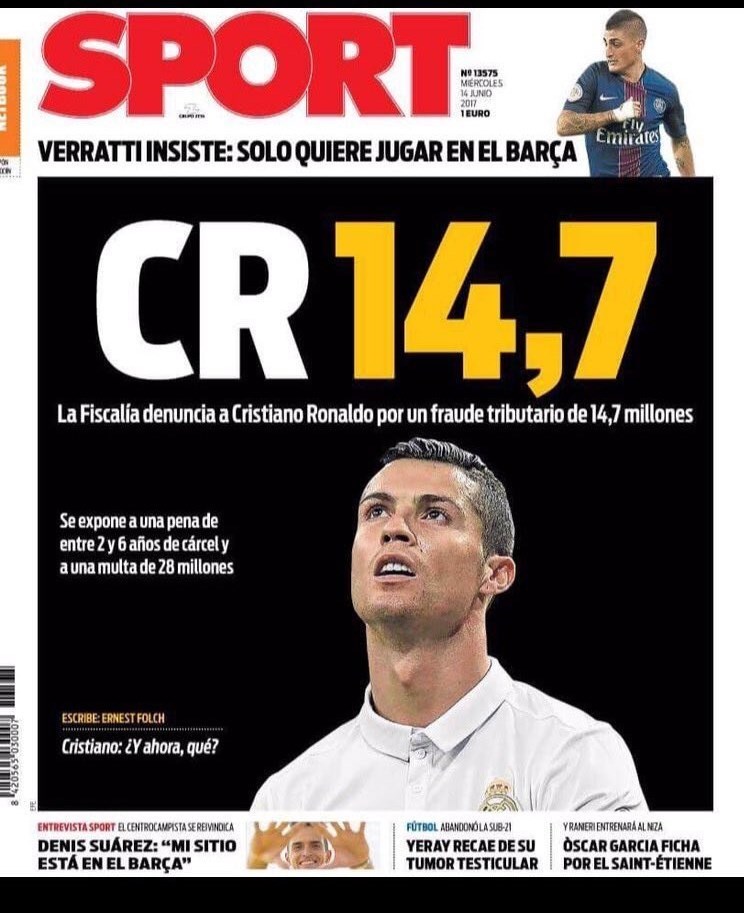 روزنامههای «موندو دپورتیوو» و «اسپورت» با استفاده از نام اختصاری رونالدو یعنی «CR7» طعنه و کنایه جالبی به کریس زدند و روی جلد خود به طور مشترک از تیتر «CR14,7» که ترکیبی از نام اختصاری و رقم تخلف مالیاتی رونالدو است، به او طعنه و کنایه تندی زدند.