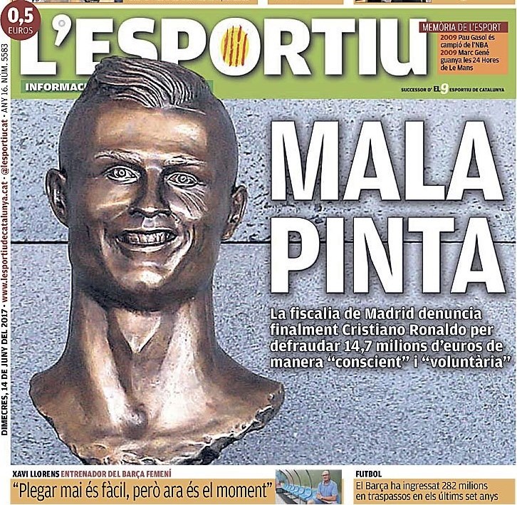 روزنامه کاتالونیایی «اسپورتیو» نیز با روی جلد بردند عکس مجسمه بحثبرانگیز مهاجم پرتغالی رئال با تیتر «بدچهره» به استقبال تخلف مالیاتی او رفته است. این در حالی است که روزنامههای مادریدی «آس» و «مارکا» که در زمان رو شدن تخلف مالیاتی مسی بسیار پرکار بودند، این بار نسبتاً عادی به این موضوع پرداختهاند و تنها از شکایت دادستانی مادرید علیه رونالدو خبر دادهاند.