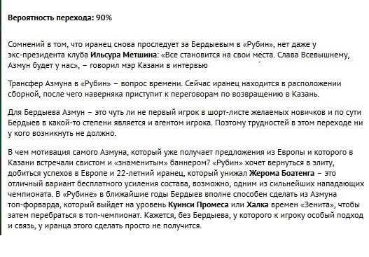 روزنامه اقتصاد روسیه با این مقدمه کوتاه نوشته است: انتقال آزمون یک موضوع زمانی است. سردار آزمون هماکنون به همراه تیم ملی فوتبال ایران است و سپس به احتمال فراوان مذاکره خود را برای بازگشت به تیم روبینکازان آغاز میکند.