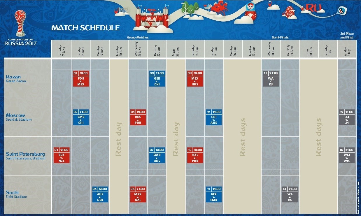 امسال اما از برزیل خبری نیست. قهرمانان 6 قاره به اضافه میزبان و فاتح جامجهانی 2014 در 2 گروه 4 تیمی از روز شنبه مدت 15 روز( از 27 خرداد تا 11 تیر) برای جام میجنگند. در گروه اول، روسیه میزبان با پرتغال، نیوزیلند و مکزیک پنجه در پنجه میاندازد و گروه دوم شامل کامرون، شیلی، استرالیا و آلمان است.