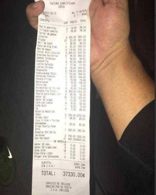 در این فاکتور که گویا یکی از کارکنان رستوران تصویر آن را منتشر کرده است، رقم 37 هزار و 300 یورو (حدود 150 میلیون تومان) برای چندین قلم سفارش از جمله 27 پیتزا و 41 نوشیدنی درج شده است که حیرت بسیاری از اهالی شبکههای مجازی را درپی داشته است.