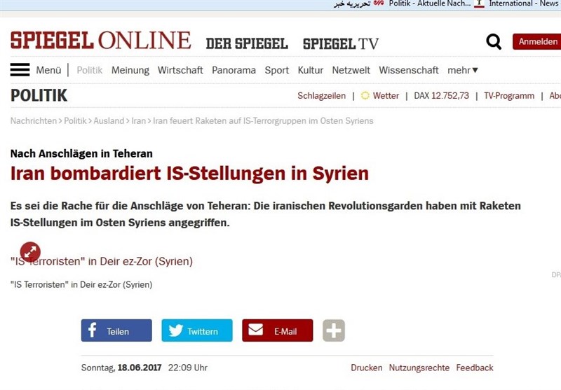 این هفته نامه آلمانی به نقل از خبرگزاری تسنیم نوشت که سپاه پاسداران شب گذشته موشک هایی را به مواضع داعش دردیرالزور شلیک کرد که به گفته سخنگوی سپاه انتقامی برای حملات تروریستی هفتم ژوئن داعش در تهران بود.
