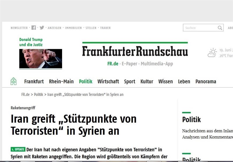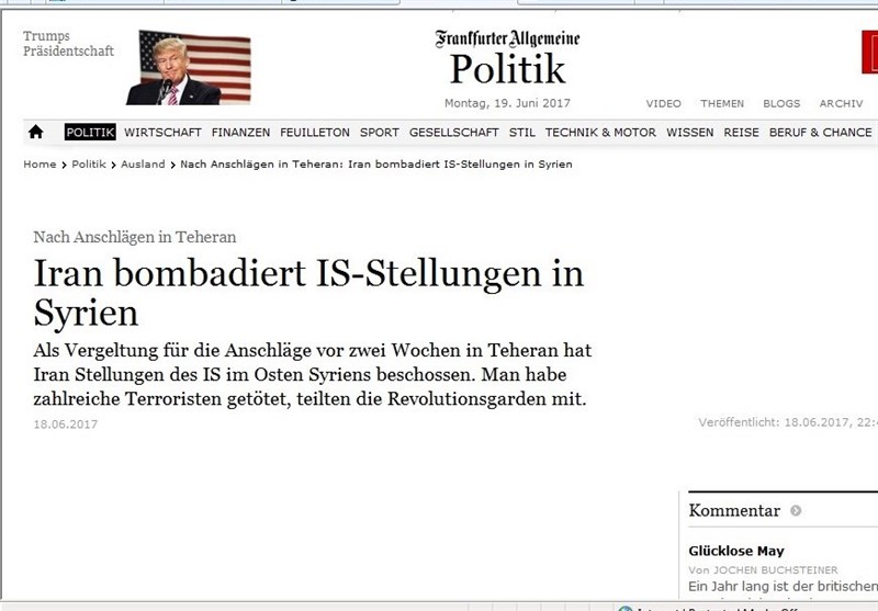 روزنامه "فرانکفورتر آلگماینه سایتونگ" آلمان نیز خبر حمله موشکی سپاه پاسداران به مواضع داعش در سوریه را پوشش داده و نوشت: ایران به عنوان انتقام از حملات تروریستی حدود دو هفته پیش داعش در تهران مواضع این گروه تروریستی در شرق سوریه را بمباران کرد. بر اساس اطلاعات سپاه پاسداران بسیاری از تروریست ها در این حمله موشکی کشته شدند.