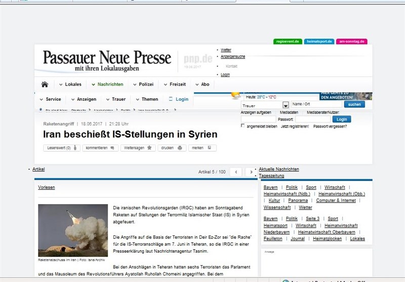 روزنامه "لایزیتسر روند شای" آلمان هم از حملات موشکی سپاه به مواضع داعش به عنوان انتقامی علیه حملات تروریستی اخیر این گروه در تهران خبر داد.
