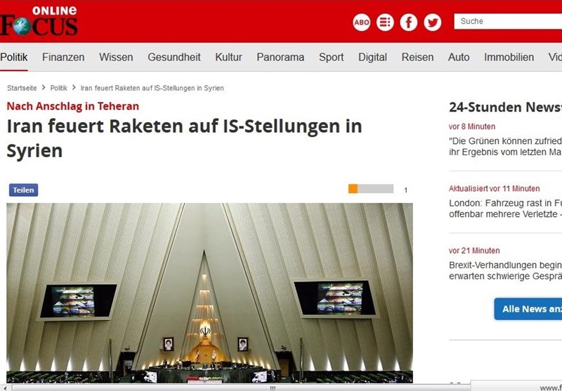 نشریه "فوکوس" آلمان نیز در مطلبی به خبر حمله موشکی ایران به مواضع تروریست های تکفیری در سوریه پرداخته و نوشت: ایران برای انتقام از حملات تروریستی داعش که در 7 ژوئن در تهران رخ داد مواضع این گروه های تروریستی در سوریه را هدف حملات موشکی خود قرار داد.