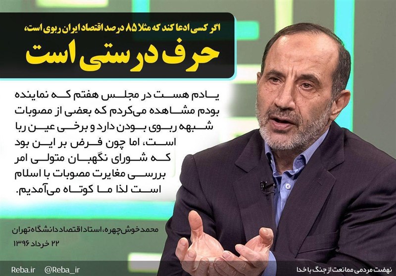 محمد خوش‌چهره در ادامه افزود: این که حجم غالب اقتصاد ما ــ خصوصاً سیاست‌های پولی و مالی متأثر از رباست ــ سخنی مطابق با واقع است. در حال حاضر در نظام اقتصادی، خصوصاً در بخش توزیع و چرخش‌های مالی، انحرافات جدی وجود دارد. وجود انحراف در ساختار اقتصادی کشور باعث شده که حتی در مراودات جاری اقتصادی مردم هم مثل رهن کامل منزل و ... انحرافات جدی داشته باشیم.