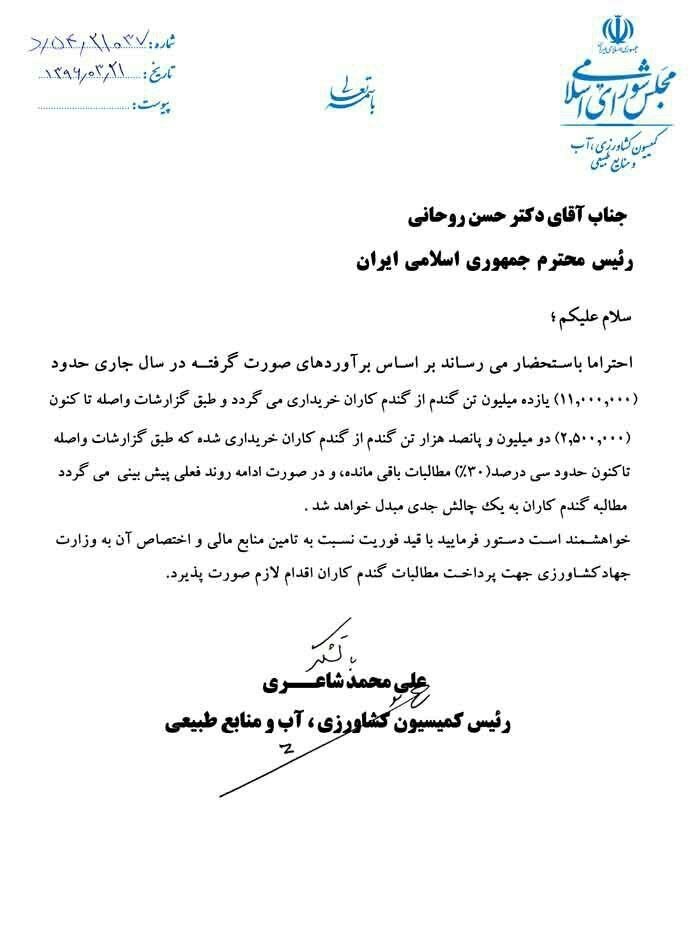 امسال نیز این مشکلات کماکان ادامه دارد. در همین راستا علیمحمد شاعری، نماینده مازندران و عضو کمیسیون کشاورزی، آب و منابع طبیعی مجلس، اخیراً در نامهای به رئیس جمهور، بر پرداخت بهموقع مطالبات گندمکاران در سال جاری تأکید کرده است. متن نامه را ببینید:
