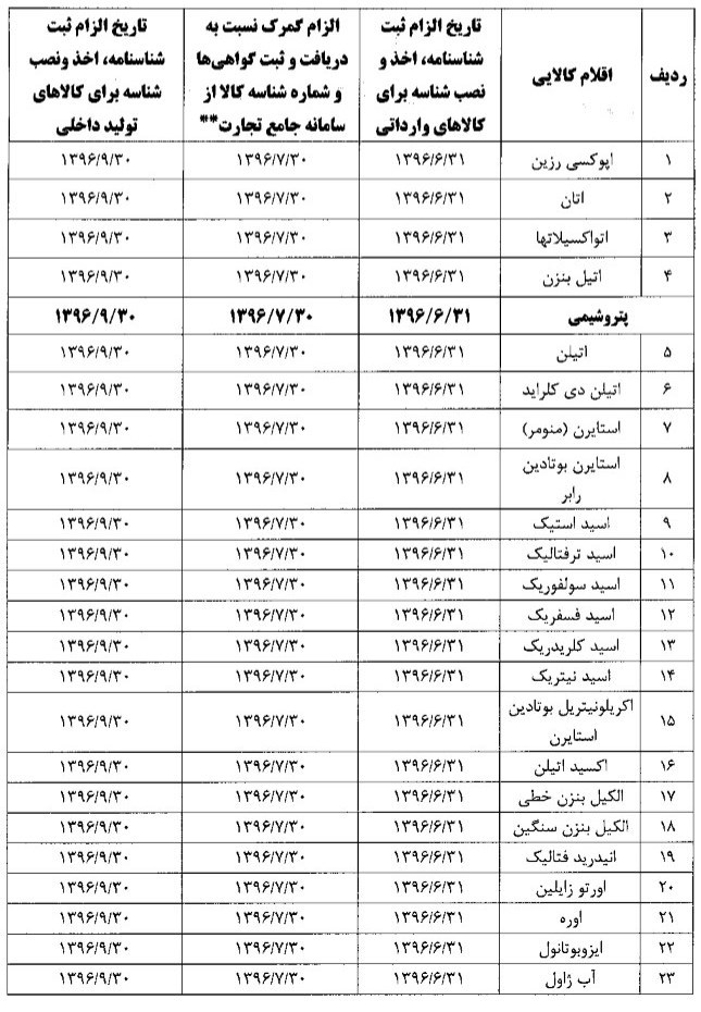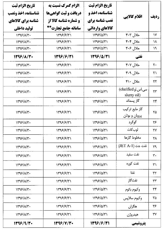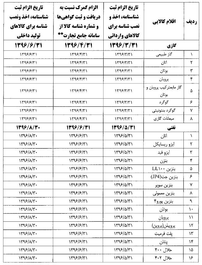 بر اساس جدول ذیل تاریخ الزام "ثبت شناسنامه اخذ و نصب شناسه" برای واردات اقلام کالایی گازی از تاریخ 31 خرداد سال جاری، فرآورده های نفتی از تاریخ 31 مرداد ماه سال جاری و زمان انجام این فرآیند برای 48 قلم محصولات پتروشیمی از تاریخ 31 شهریور سال جاری است.