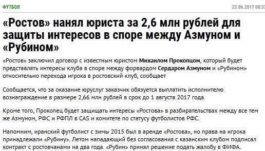 به گزارش خبرگزاری تسنیم و به نقل از سایت حقوق روسیه، باشگاه روستوف با میخائیل پروکوپتس، وکیل مشهور فوتبال روسیه قراردادی را امضا کرد که براساس آن نمایندگی این باشگاه را در جریان مناقشه انتقال سردار آزمون از روبینکازان را بر عهده دارد.