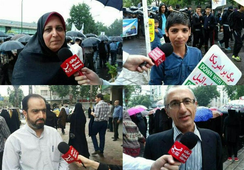 یکی از شهروندان که دست در دست فرزند کوچک خود به راهپیمایی روز قدس آمده بود گفت: یکی از دلایل آمدن به راهپیمایی دفاع از مردم مظلوم فلسطین است مردمانی که از زمان کودکی سنگ مبارزه با اسرائیل را در دست میگیرند تا با دشمنی که وارد کشورشان شده مبارزه کنند و در شرایط سختی از سرزمین خود حمایت میکنند.