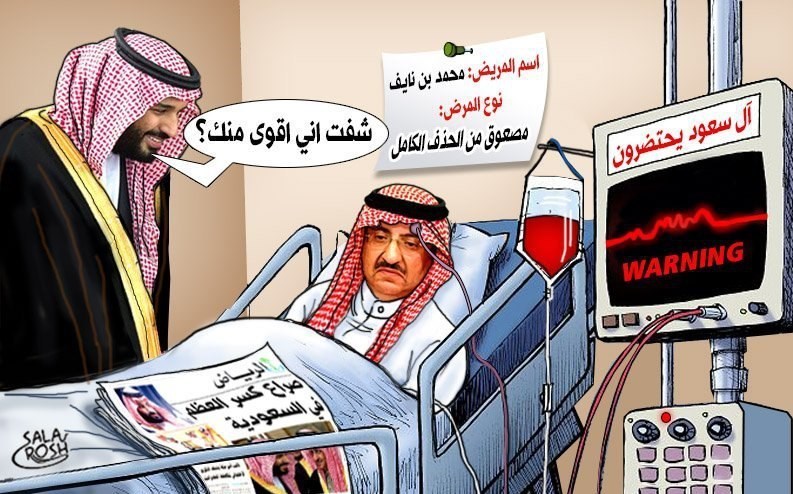 در این تصویرسازی، محمد بن نایف به عنوان یک مریض که دچار «شوک حذف کامل» شده است روی تخت بیمارستان و با چهرهای غمگین نشسته است، در حالی که محمد بن سلمان، ولیعهد جدید عربستان خطاب به محمد بن سلمان میگوید «دیدی من از تو قویتر هستم؟».
