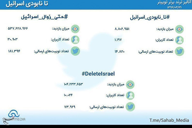 آمار مشارکت در کمپینهای #تا_نابودی_اسرائیل، #حتى_زوال_اسرائیل و #DeleteIsrael که توسط موسسه داده کاوی سحاب ارائه شده است نشان میدهد که این هشتگ در کشورهای #لبنان #یمن #بحرین #پاکستان #ایران به عنوان تاپ ترند و ترند چهارم #عراق شد.