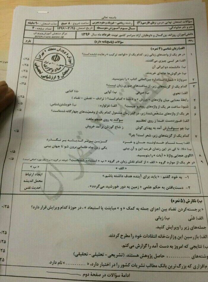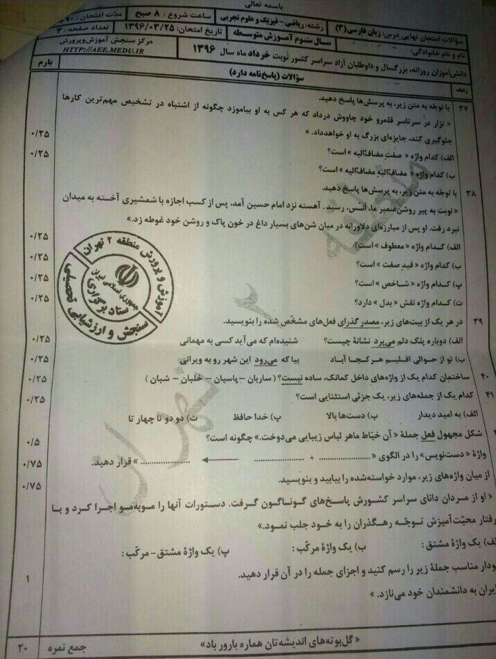 به گفته برخی از معلمان، سوال درس زبان فارسی ساعت 7 صبح از منطقه دو آموزش‌وپرورش شهر تهران لو رفت و از طریق فضای مجازی دردست دانش آموزان قرارگرفته بود حتی برخی می‌گویند این سوالات به رقم یک میلیون تومان به فروش رسیده بود. و این مسئله تأییدی بر جدی‌گرفتن موضوع نظارت و بازرسی در امر ارزشیابی آموزش و پرورش است.