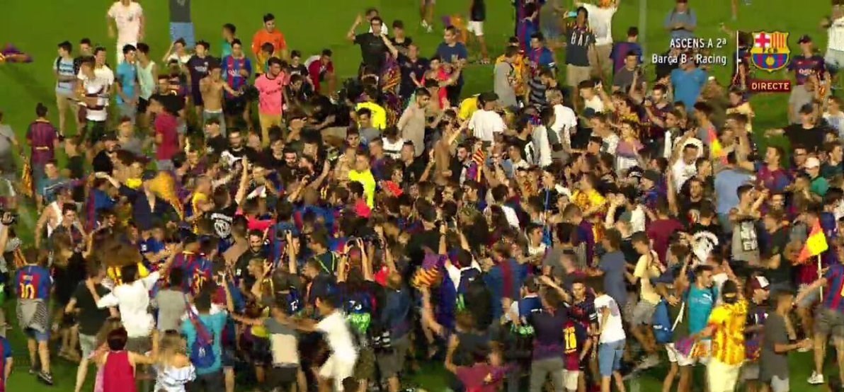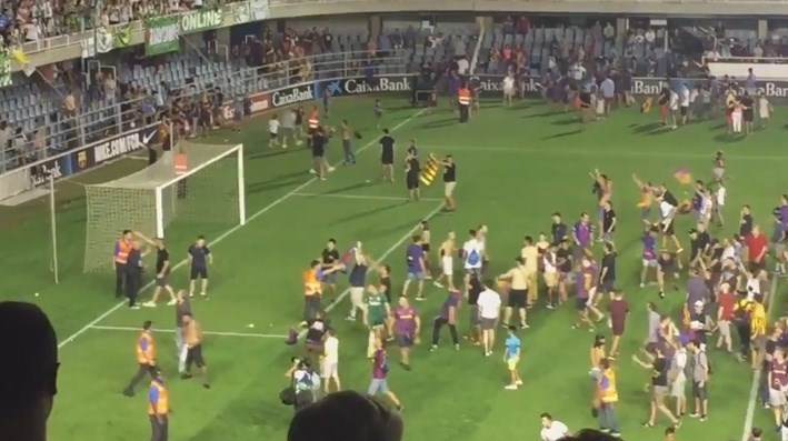 در پایان این بازی اما اتفاقات غیرمنتظرهای رخ داد. هواداران تیم فوتبال بارسلونا B پس از به صدا در آمدن سوت پایان مسابقه به زمین بازی ورزشگاه مینیاستادی هجوم بردند. در همان حال گروهی از هواداران راسینگ هم از ناکامی تیمشان عصبانی بودند به زمین بازی رفتند و به این ترتیب درگیری میان هواداران دو تیم آغاز شد که در جریان آن هر یک از دو گروه علاوه بر شعار دادن علیه یکدیگر، اشیایی را هم به سمت هم پرتاب کردند.