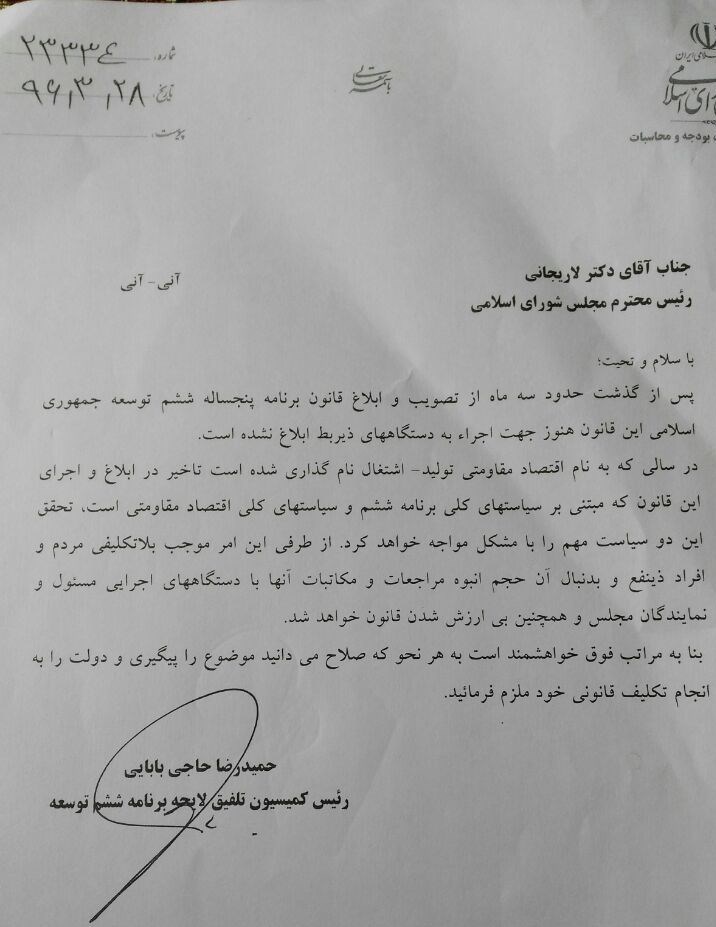 متن نامه حاجیبابایی به لاریجانی به شرح زیر است: