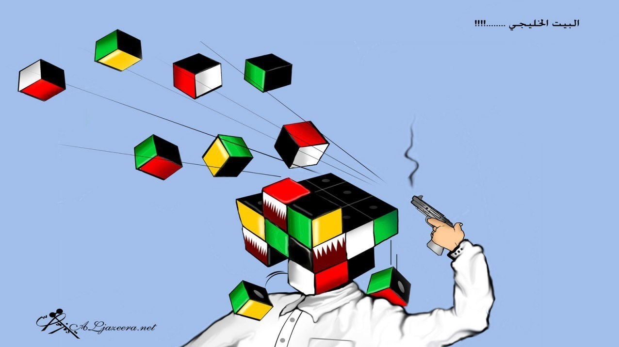 در یکی از موارد، هنرمند عرب‌زبان در کاریکاتور خود عربستان را به‌صورت فردی به تصویر کشیده است که به جای حل معمای قطر و چگونگی کنترل آن، در حال شلیک به سر خود است برای پاک کردن صورت مسئله است.