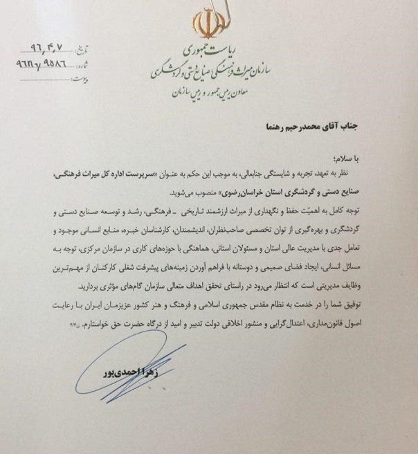 به گزارش خبرگزاری تسنیم از مشهدمقدس، محمدرحیم رهنما با حکم معاون رئیس جمهور به عنوان سرپرست اداره کل میراث فرهنگی خراسان رضوی منصوب شد.