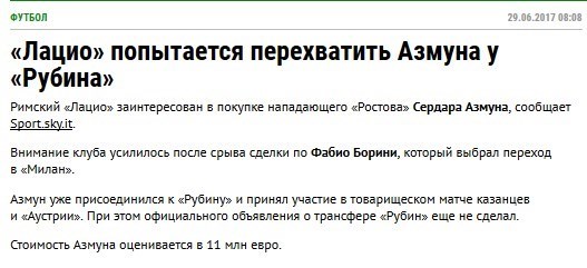 در ادامه این خبر آمده است: آزمون هم‌اکنون به تیم روبین کازان ملحق شده و در دیدار تدارکاتی این تیم برابر آستریاوین اتریش هم شرکت کرده است. البته هنوز انتقال سردار آزمون به تیم روبین‌کازان اعلام رسمی نشده است.