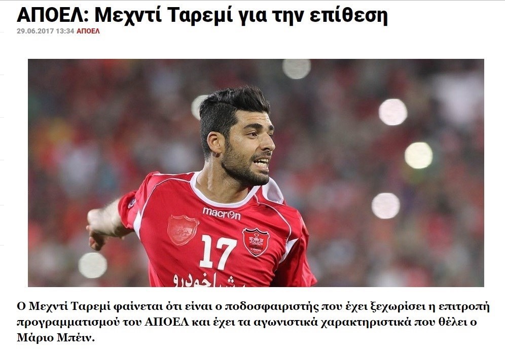 به گزارش خبرگزاری تسنیم، مهدی طارمی یکی از بازیکنانی است که به نظر می‌رسد در برنامه نقل‌وانتقالاتی باشگاه آپوئل نیکوزیای قبرس قرار دارد. ماریو بین، سرمربی هلندی این تیم او را در لیست خرید خود قرار داده و از مسئولان باشگاه خواسته است مقدمات جذب این بازیکن را فراهم آورند.