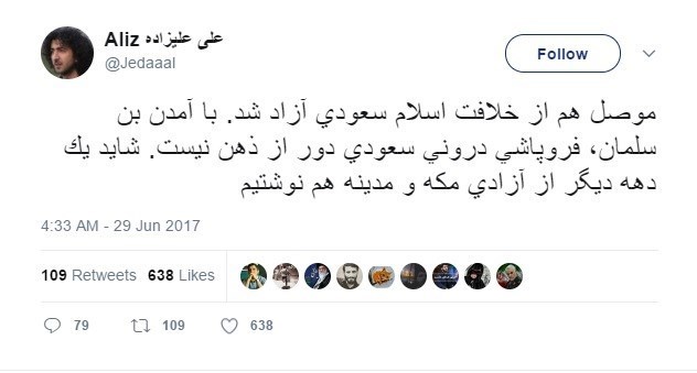 به گزارش گروه رسانه های خبرگزاری تسنیم، علی علیزاده کارشناس و تحلیلگر مسائل سیاسی همزمان با آزادسازی مسجد النوری و گلدسته الحدباء در موصل قدیم از داعش در صفحه توئیتر خود نوشت: موصل هم از خلافت اسلام سعودی آزاد شد. با آمدن بن سلمان، فروپاشی درونی سعودی دور از ذهن نیست. شاید یک دهه دیگر از آزادی مکه و مدینه هم نوشتیم.