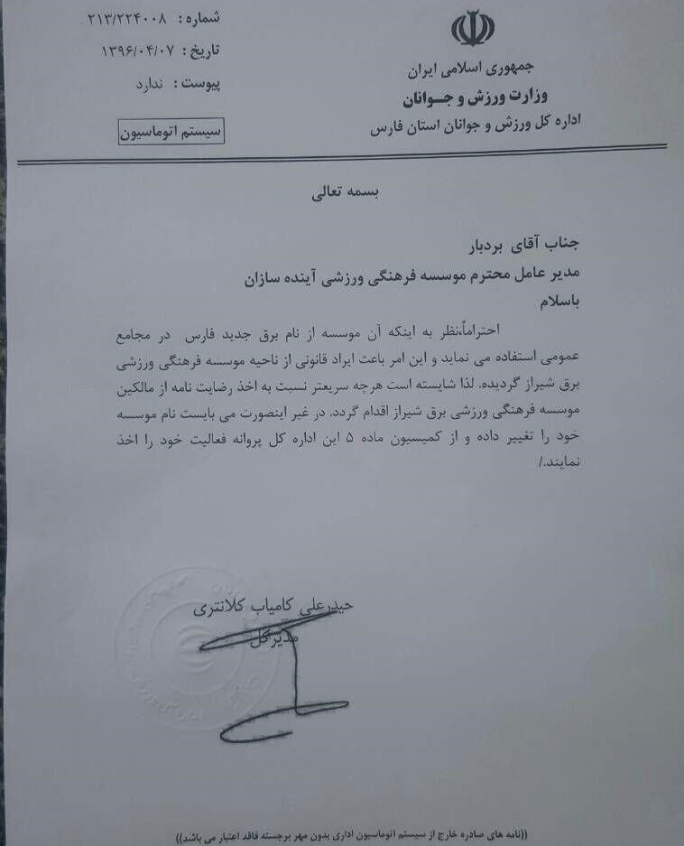 شیروانی از ابتدای فعالیت تیم «آیندهسازان برق جدید فارس» همواره شکایت و نارضایتی خود را از این تیم بابت استفاده از نام «برق جدید فارس» در مجامع عمومی اعلام کرده بود و پیگیریهای مکرر وی سبب شد که مدیرکل ورزش و جوانان استان فارس روز گذشته طی نامهای خطاب به مدیرعامل باشگاه «آیندهسازان برق جدید فارس» خواهان اخذ رضایت از مالکان باشگاه برق قدیم شیراز یا تغییر نام این باشگاه شود.