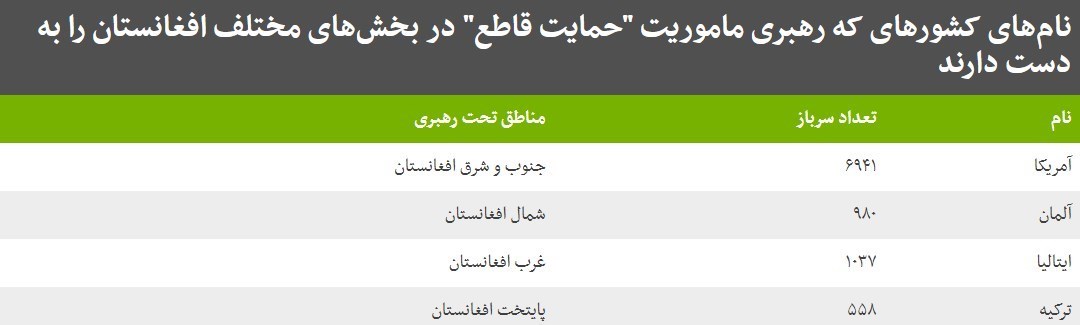 آمریکا رهبری آموزش، مشاوره و کمک را در جنوب و شرق افغانستان به عهده دارد. آلمان در شمال و ایتالیا در غرب و ترکیه در پایتخت افغانستان این مسئولیت را به عهده دارند.