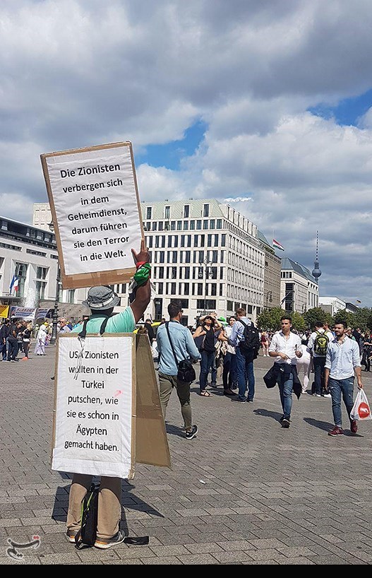 ــ امسال اولین بار روز قدس در برلین بودم. قدس، تنها روز سال است که همه اندکی اجازۀ حرف زدن و فرصت اظهارنظر دربارۀ اسرائیل را دارند. من معمولاً سه پلاکارد میتوانم حمل کنم، یکی جلوی سینهام، پشتم و بالای سرم. ولی امسال هفت پلاکارد به تظاهرات ساعت 14 بردم تا اگر کسانی از من پلاکارد خواستند، بهشان بدهم و خودم فردا کمی استراحت کنم (میخندد).