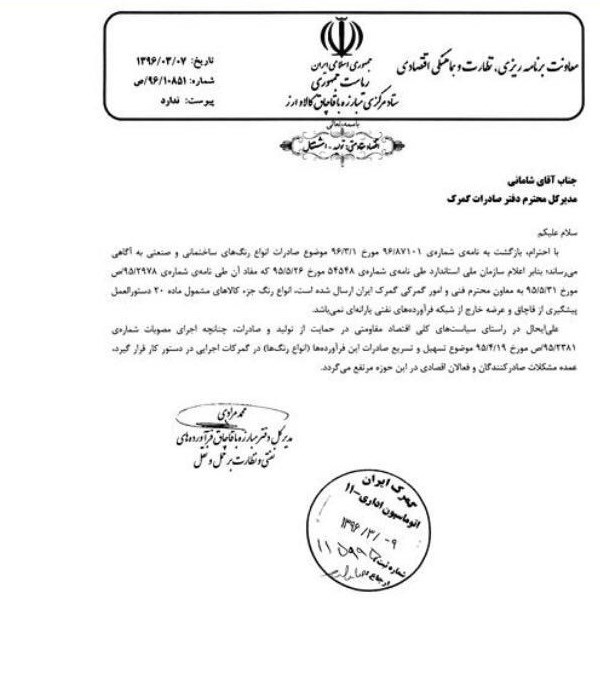 3- مطابق مفاد بخشنامه ردیف 434 مورخ 24/11/89 صادرات رنگهای ساختمانی مشمول ضوابط استاندارد اجباری بوده لیکن انجام تشریفات صادرات آنها خارج از شمول دستورالعمل اصلاحی پیشگیری از قاچاق و عرضه خارج از شبکه فرآورده های نفتی یارانه ای می باشد. لذا در زمان اظهار نسبت به اخذ گواهی کاربرد علامت استاندارد ملی از ذینفع یا ارسال نمونه به آزمایشگاه استاندارد جهت صدور گواهی انطباق اقدام نمایند.