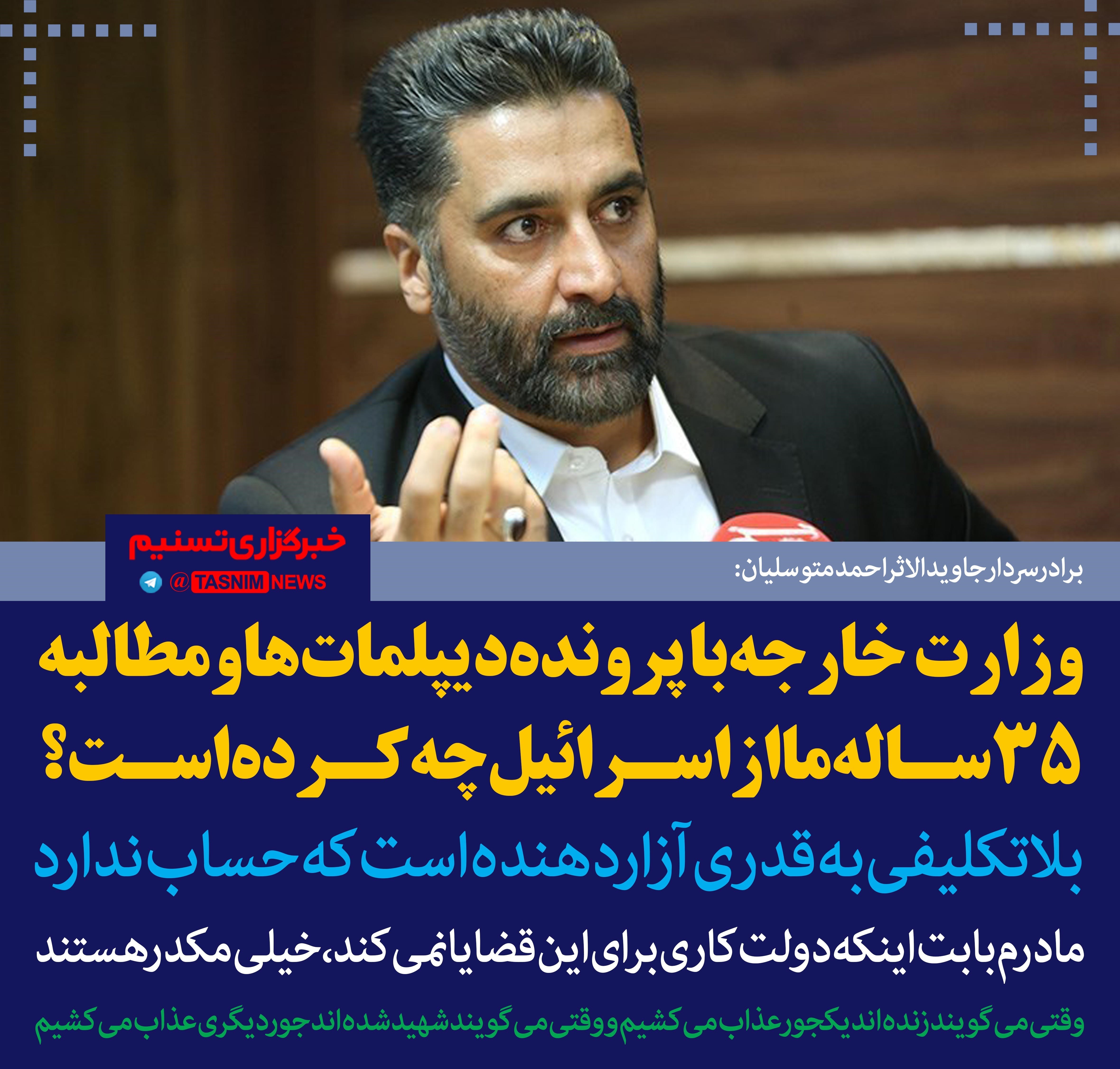 برادر سردار جاویدالاثر احمد متوسلیان می‌گوید: سوال من از دولت و وزارت خارجه اینست که در این 35 سال با مطالبه‌ای که از اسرائیل دارید چه کرده‌اید؟