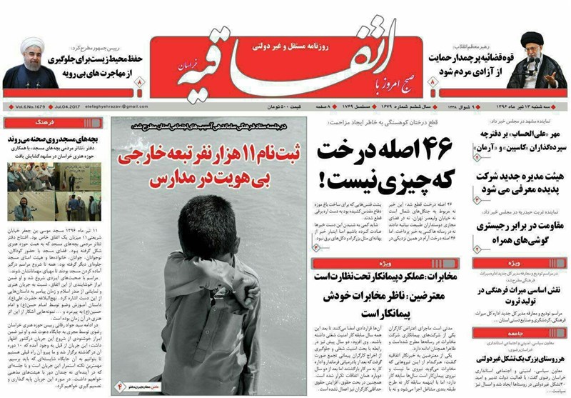 نکته جالب این است که در این اواخر گاهی میبینیم که حتی به یک رویداد مثبت که حاصل دوراندیشی و نگاه انسانی مسئولان نظام اسلامی است، با چشم تردید مینگرند، نظیر تیتر روز سه شنبه 13 تیر 96 روزنامۀ اتفاقیه که با عکسی در همان مسیر همراه شده است: «ثبت نام 11 هزار نفر تبعۀ خارجی بیهویت در مدارس».