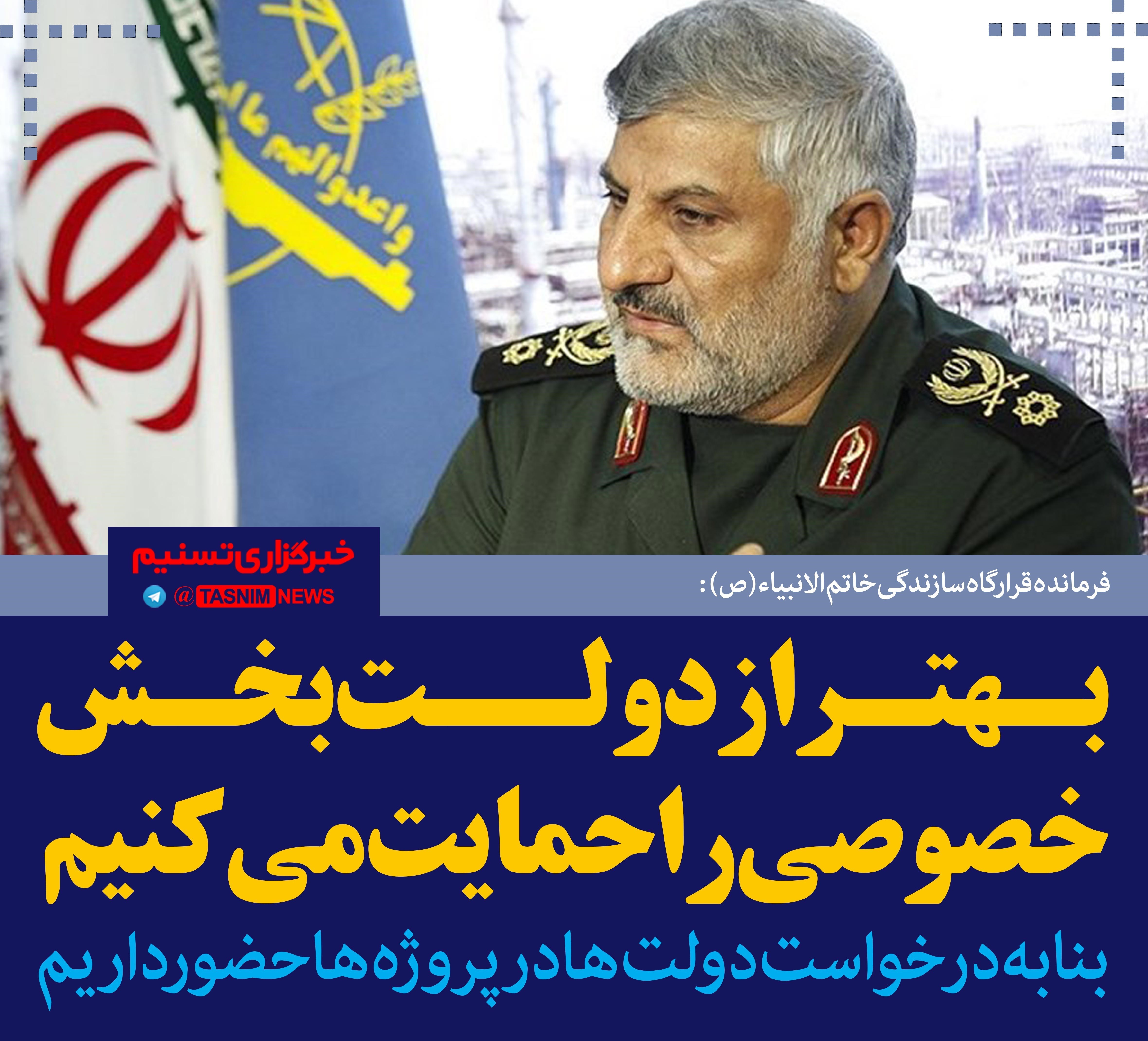 فرمانده قرارگاه سازندگی خاتم الانبیاء(ص) گفت:‌ این قرارگاه اصراری برای ورود به پروژه‌ها ندارد و بنا به درخواست و نیاز دولت‌ها بر سر پروژه ها حضور دارد.