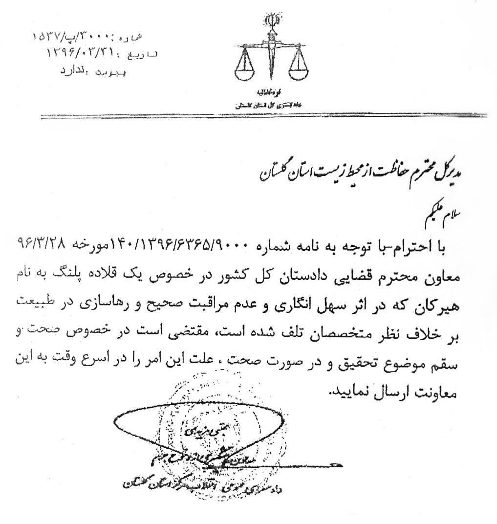 در همین راستا، معاون پیشگیری از وقوع جرم دادسرای عمومی انقلاب استان گلستان، با ارسال نامه ذیل به مدیرکل حفاظت محیط زیست استان گلستان، پرونده هیرکان را در دست بررسی قرار داده است: