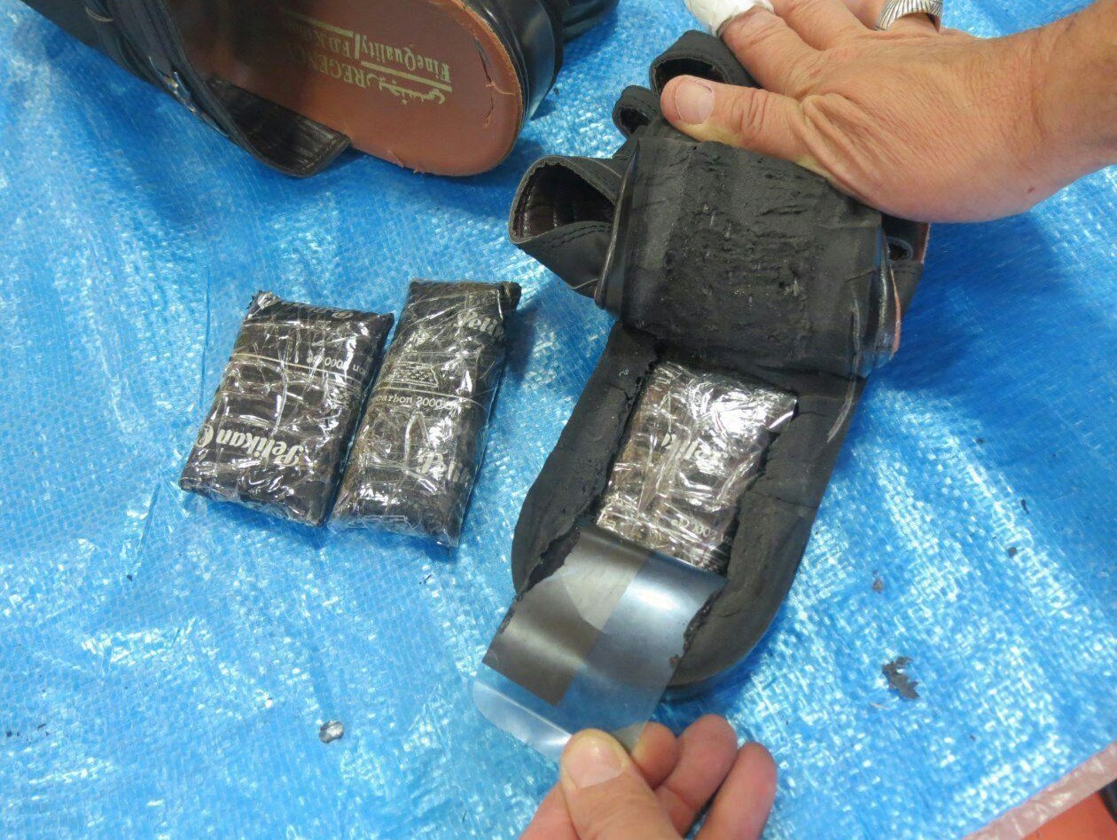 شیره تریاک کشف شده از داخل پاشنه کفش صندل به مقدار 292 گرم بوده که به طرز ماهرانه ای پس از شکافتن زیره کفش در لابلای زیره و در قسمت پاشنه صندل جاسازی شده بود اما با هوشیاری ماموران گمرک ، مواد مخدر جاسازی شده کشف گردید.