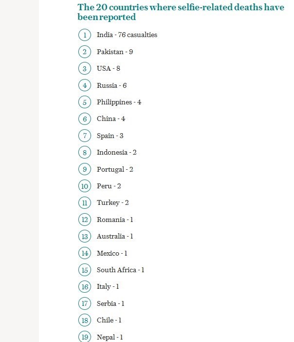 این مطالعه نشان داد که 76 مورد از 127 مرگ و میر ناشی از «سلفی» در بازه زمانی ذکر شده در هند رخ داده است.