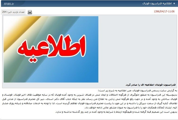 با اینکه در متن اطلاعیه فدراسیون فوتبال هیچ اشارهای به استعفا نشده، اما نوشته شده اسدی «تقاضای کنارهگیری» داشته و در این مورد با مهدی تاج تفاهم شده است، یعنی اسدی خواسته برود در حالی که استعفایی نکرده است. این را نزدیکان به او میگویند و تأکید میکنند هیچگونه استعفایی از سوی اسدی به فدراسیون ارائه نشده است. اگر هم تقاضای کنارهگیری کرده که باید این موضوع مکتوب باشد.