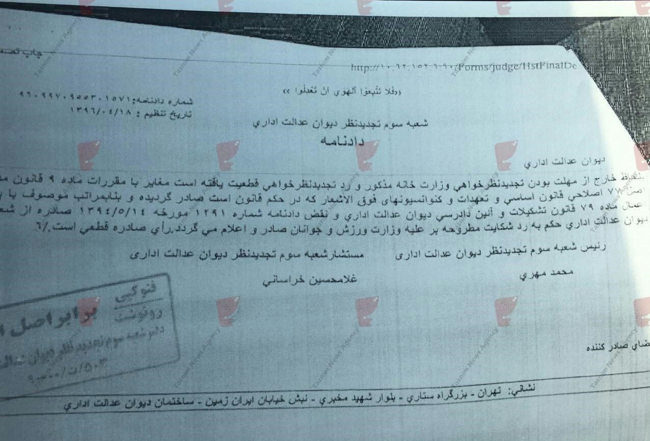 به گزارش خبرنگار ورزشی خبرگزاری تسنیم رای قطعی جلسه تجدیدنظر دیوان عدالت اداری درخصوص پرونده فدراسیون تیراندازی صادر شد و براساس آن رای صادره از طرف دیوان عدالت اداری مبنی بر برکناری سیدمهدی هاشمی از فدراسیون تیراندازی و برگزاری انتخابات مجدد نقض شد.