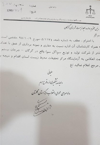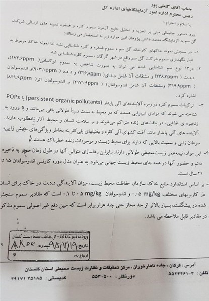 لازم به ذکر است اداره کل حفاظت محیط زیست استان گلستان که شنیدهها حاکی از مماشات مسئولانش با مدیران شرکت گلسم دارند، پس از وصول دستور قضایی و نمونهبرداری از خاک مشکوک به آلودگی، نمونهها را به آزمایشگاهی میسپارند که میزان سموم را در نمونهها کمتر از یک صدم برابر حد مجاز اعلام کرده تا مقدمات تبرئه این شرکت را از تخلفاتی که جان هموطنان را به بازی گرفته فراهم آورده باشد.