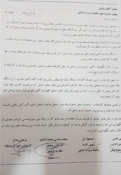 سپس به دنبال اصرار شاکی مبنی بر تخلیه هزاران لیتر از انواع سموم فاسد و تاریخ گذشته در محوطه کارخانه و انبار آن در شهر گرگان و با توجه به بوی قابل استشمام سم از نمونههای خاک، نمونه به آزمایشگاه معتمد دیگری سپرده شده و نتایجی ناگوار به دست میآید: وجود 13 نوع سم کلره مهلک که میزان آنها در خاک، تا دو هزار برابر حد مجاز اعلام میشود.