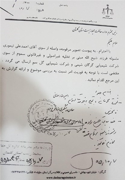 در واقع شرکتی که با دفن سموم مهلک در خاک، سلامت ساکنان استان گلستان و محیط زیست منطقه را تا سالیان متمادی با خطر جدی از جمله ابتلا به بیماریهایی مهلک چون سرطان روبهرو ساخته است بدون آن که به عنوان یک واحد آلاینده متخلف به مراجع قضایی معرفی شود و بیآنکه ابعاد اقدام بالقوه فاجعه بار آن به طور دقیقتر و با قید فوریت مورد بررسی میدانی و آزمایشگاهی قرار بگیرد و با صدور حکمی متناسب با تهدید بهداشت عمومی، از تکرار این تخلفات مهلک منع شود، اکنون تنها به پاکسازی منطقه آن هم بدون الزام به نظارت خاصی موظف شده است؛ بیآنکه تاکنون خبری نیز از اجرای همین حکم رقیق گزارش شده باشد.