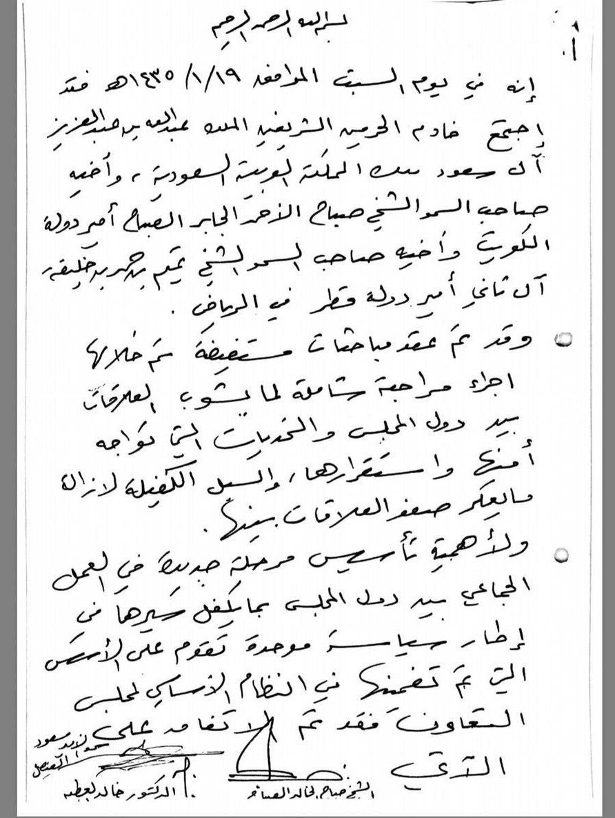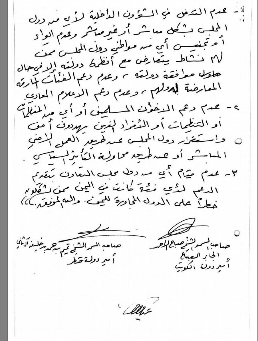 اولین توافق که به صورت دستنوشته است و مربوط به تاریخ 23 نوامبر 2013 است به امضای پادشاه عربستان سعودی و امیر قطر و امیر کویت رسیده است. این توافق، طرفین را به اجتناب از مداخله در امور داخلی سایر کشورهای حاشیه خلیج فارس، اجتناب از حمایت مالی یا سیاسی از گروههای «منحرف» متعهد میکند.