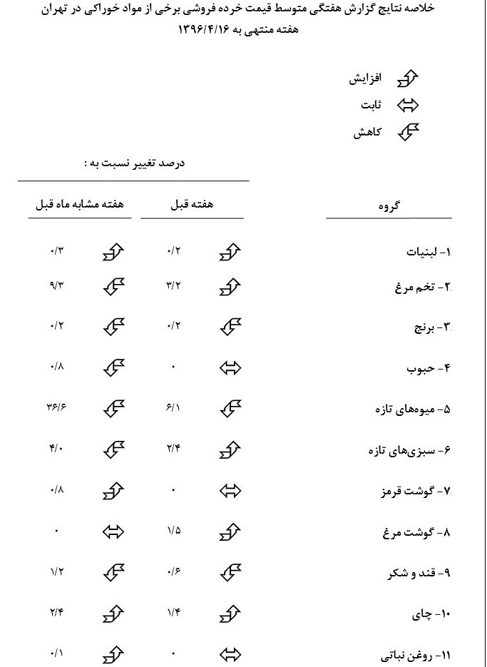 براساس آمار منتشر شده از سوی بانک مرکزی، تغییرات قیمت ها نسبت به هفته مشابه سال گذشته نشان می دهد که قیمت تخم مرغ 24.9 درصد، لبنیات 7.5 درصد، برنج 10.7 درصد، حبوب 23.5 درصد، سبزی های تازه 34.7 درصد، گوشت قرمز 20.9 درصد، قند و شکر 11 درصد، چای 23.2 درصد و روغن نباتی 8.5 درصد رشد قیمت داشته اند، ولی قیمت گوشت مرغ 1.5 درصد و میوههای تازه 3.1 کاهش یافته است.